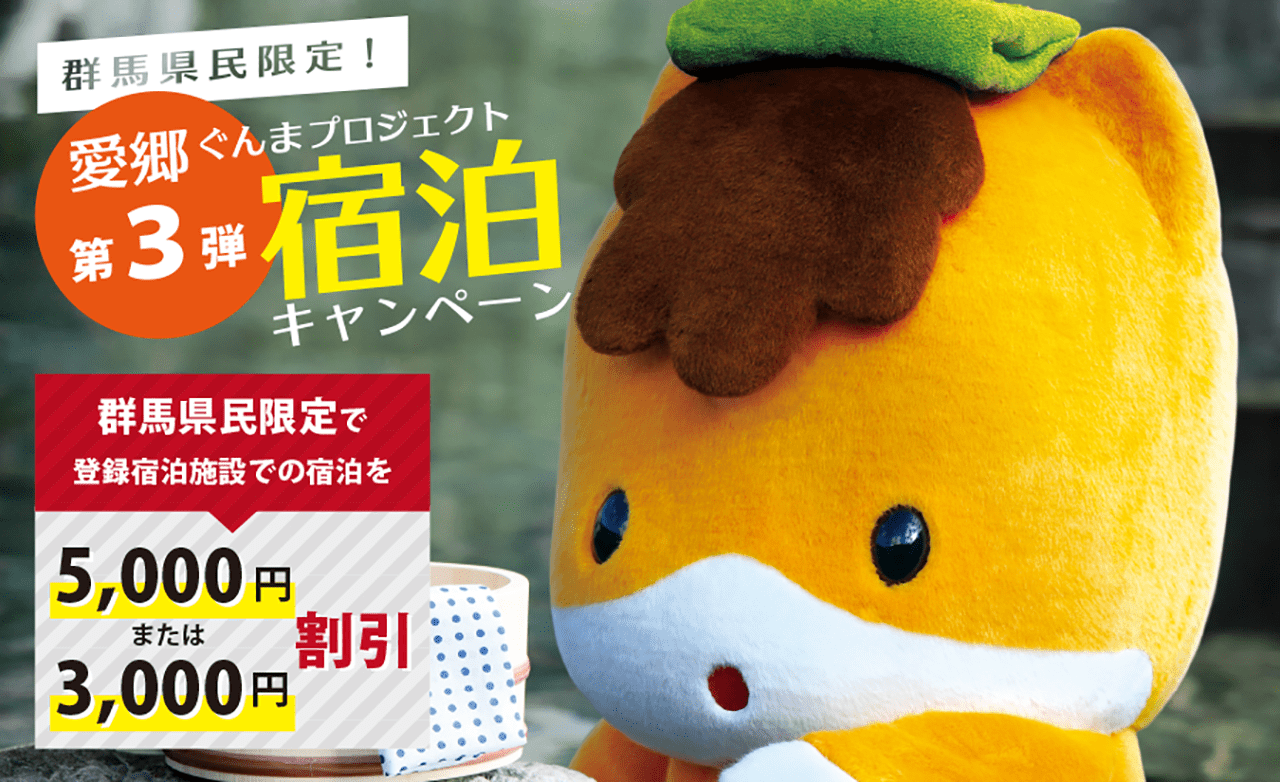 群馬県民のお客さまは1人1泊あたり5,000円割引(または3,000円割引)と大変お得にご利用いただけます。